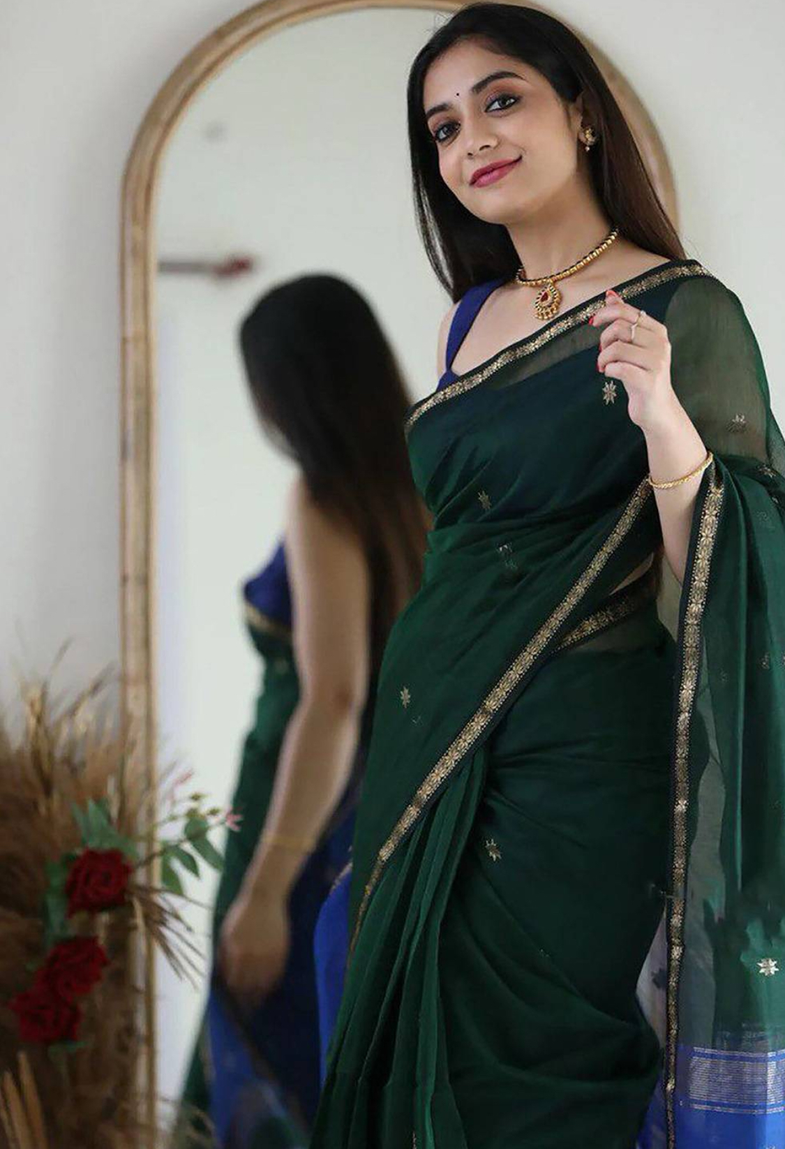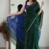 This saree measures 5.5 meters in length and 45 inches in width, accompanied by a matching blouse piece of 0.8 meters. Crafted from premium fabric, it offers elegance and comfort. Hand wash separately in cold water, avoid soaking over 5 minutes, and use medium iron for maintenance.