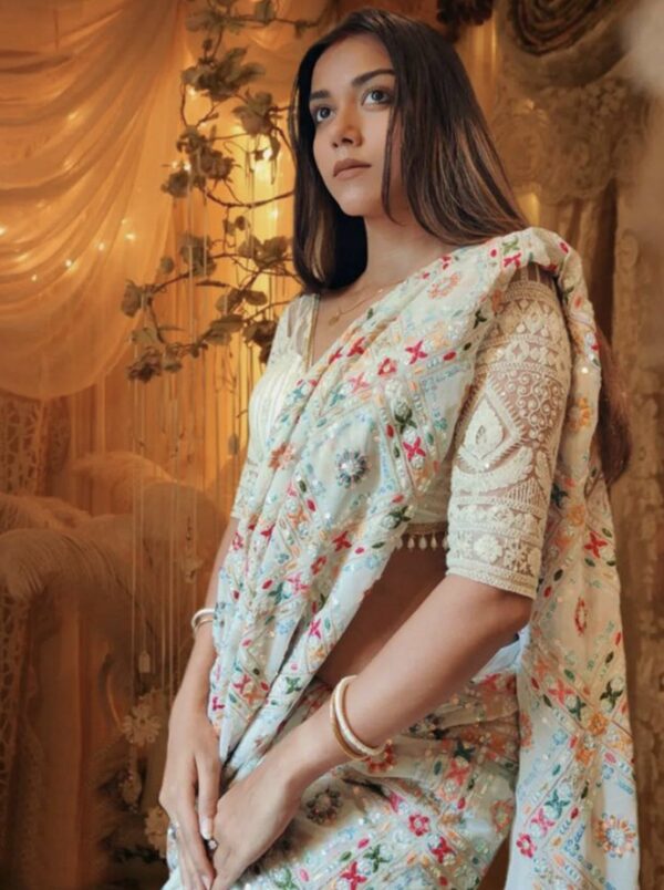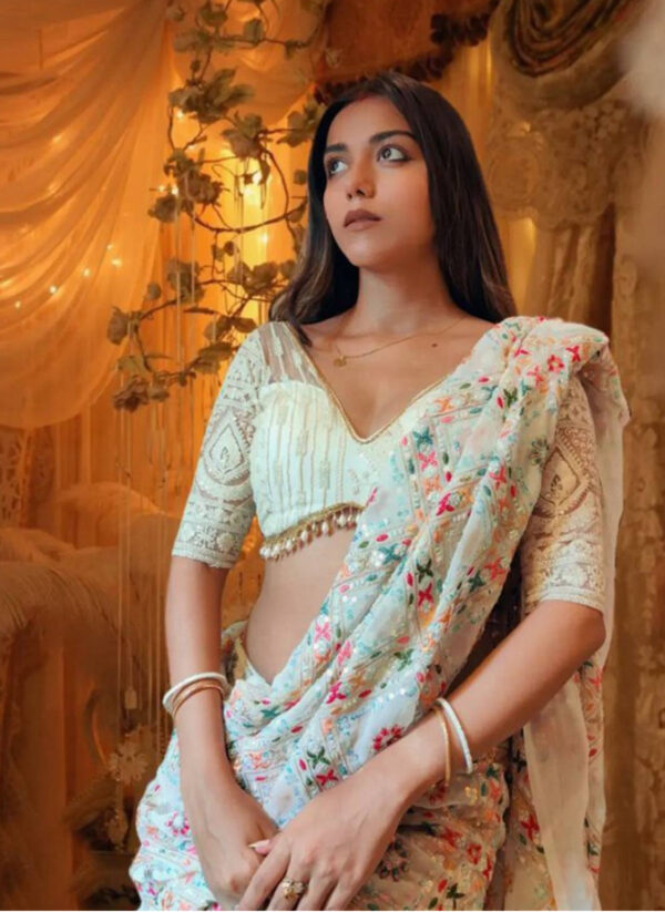 This saree measures 5.5 meters in length and 45 inches in width, accompanied by a matching blouse piece of 0.8 meters. Crafted from premium fabric, it offers elegance and comfort. Hand wash separately in cold water, avoid soaking over 5 minutes, and use medium iron for maintenance.