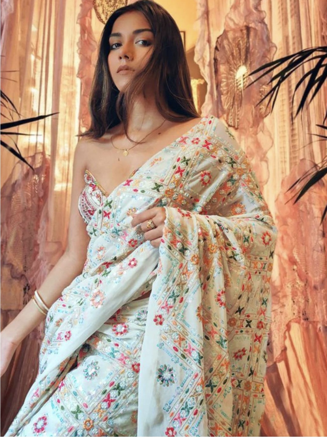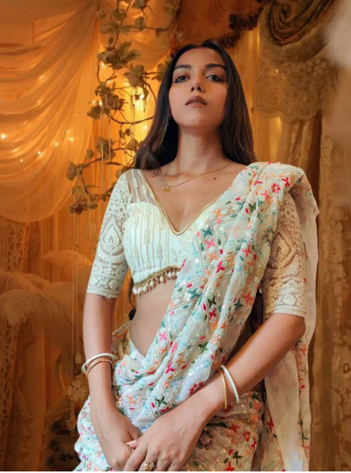 This saree measures 5.5 meters in length and 45 inches in width, accompanied by a matching blouse piece of 0.8 meters. Crafted from premium fabric, it offers elegance and comfort. Hand wash separately in cold water, avoid soaking over 5 minutes, and use medium iron for maintenance.