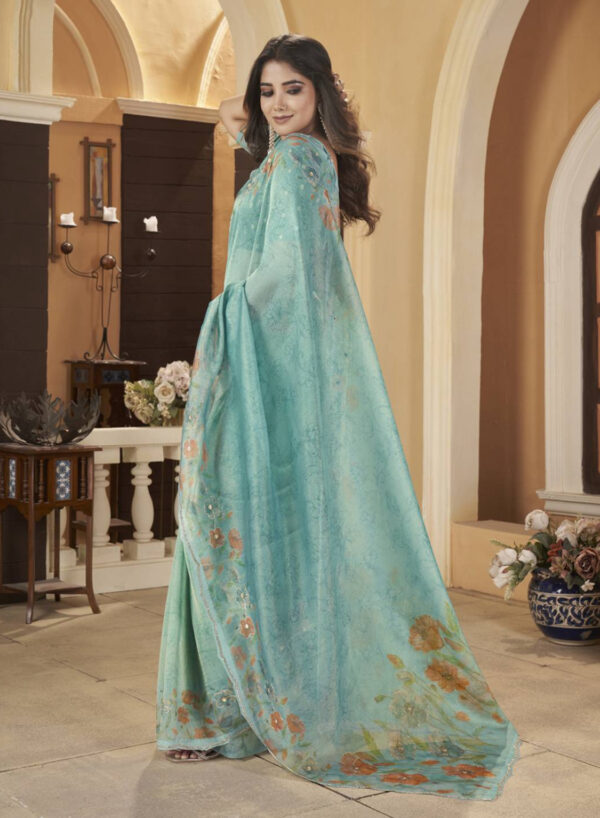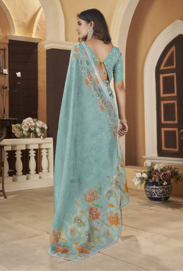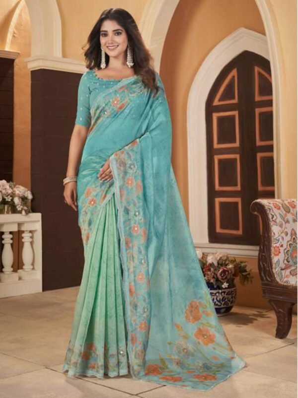 This saree measures 5.5 meters in length and 45 inches in width, accompanied by a matching blouse piece of 0.8 meters. Crafted from premium fabric, it offers elegance and comfort. Hand wash separately in cold water, avoid soaking over 5 minutes, and use medium iron for maintenance.