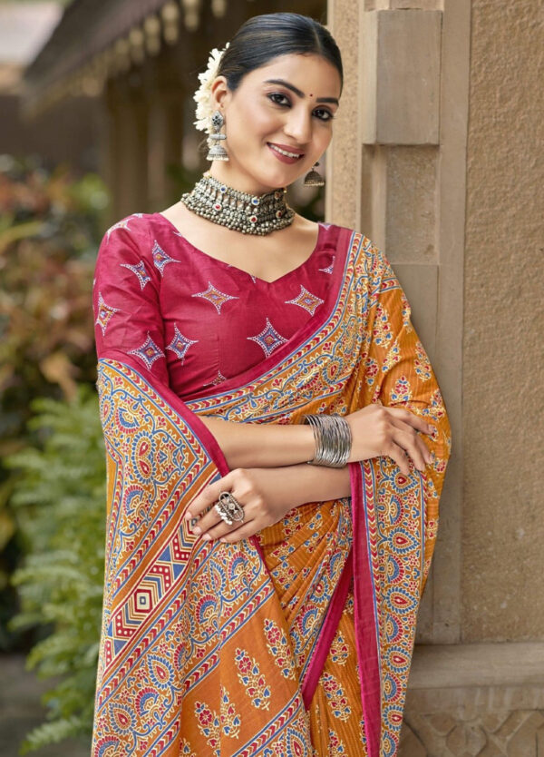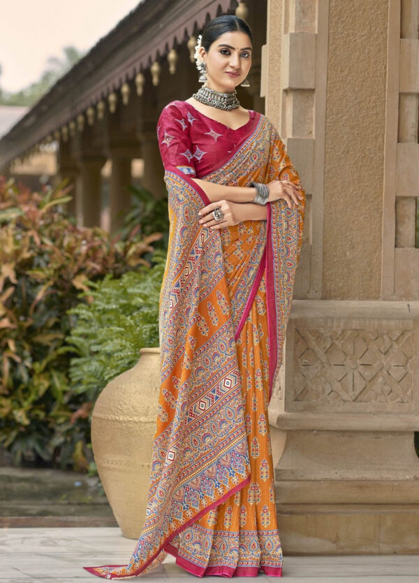 This saree measures 5.5 meters in length and 45 inches in width, accompanied by a matching blouse piece of 0.8 meters. Crafted from premium fabric, it offers elegance and comfort. Hand wash separately in cold water, avoid soaking over 5 minutes, and use medium iron for maintenance.