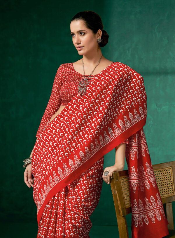 This saree measures 5.5 meters in length and 45 inches in width, accompanied by a matching blouse piece of 0.8 meters. Crafted from premium fabric, it offers elegance and comfort. Hand wash separately in cold water, avoid soaking over 5 minutes, and use medium iron for maintenance.